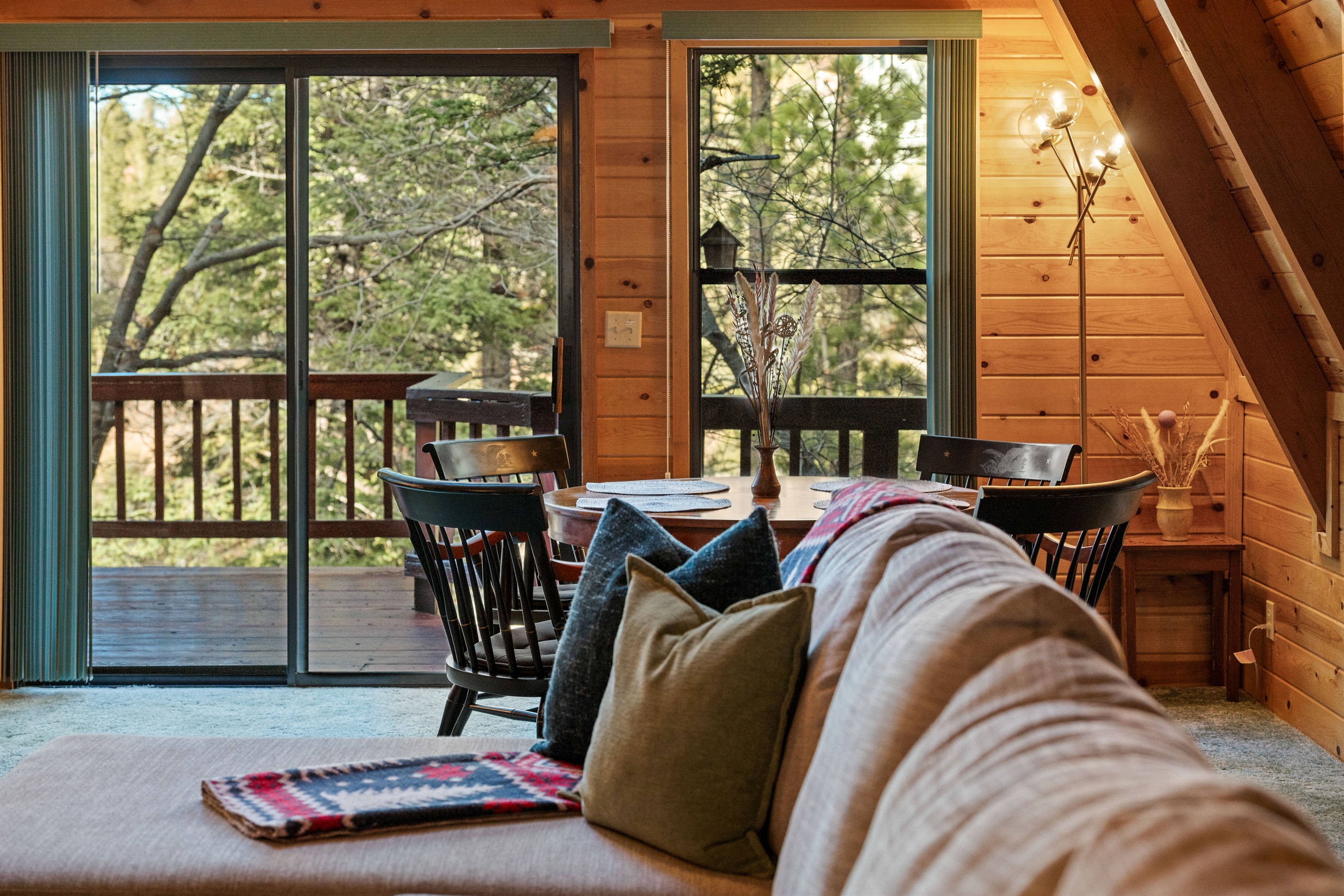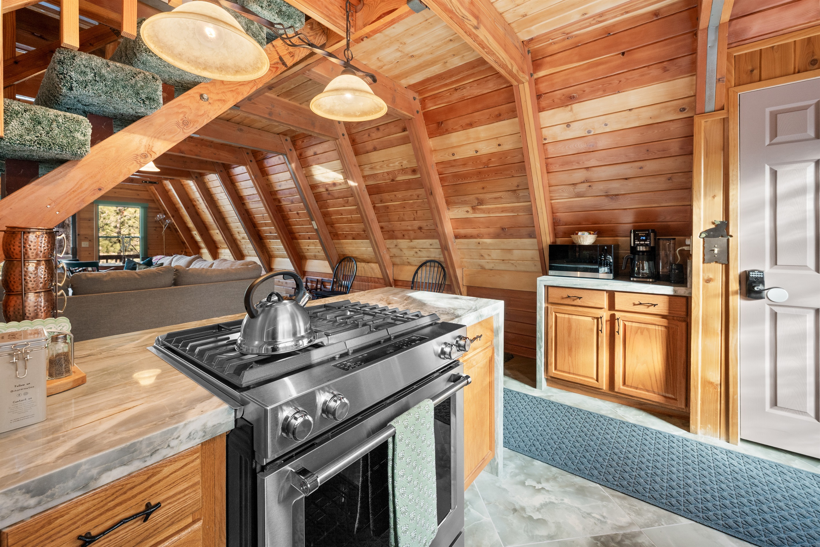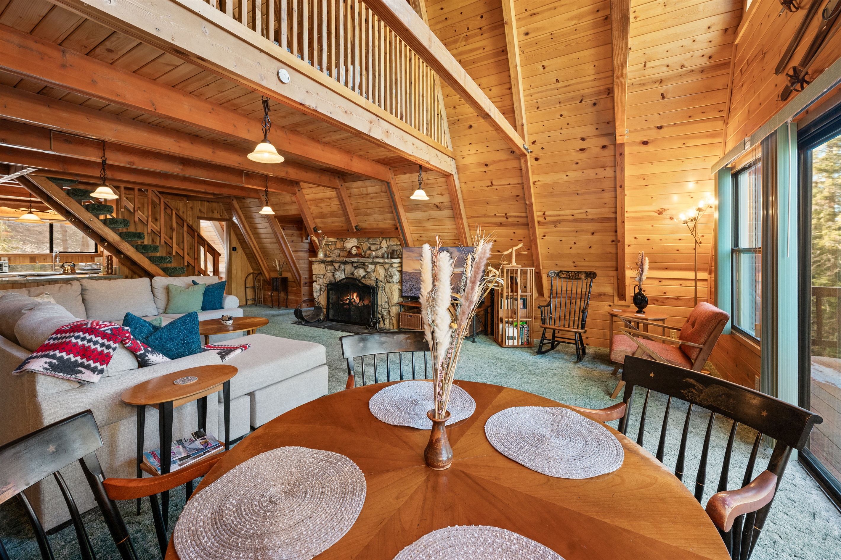 The recently renovated 1,328 sq ft cabin features a warm woodsy interior, vaulted ceilings, open-concept living room, wood-burning stone fireplace, plenty of comfortable seating, and large A-frame windows to bring the outside in. There is a large sectional couch and separate sitting corner. The cabin is decorated with vintage and antique pieces that give the space a nostalgic feeling. It's a great place to gather and unwind after an outdoor adventure. Enjoy the plush throw blankets, cozy fireplace, 65" smart TV, fast 1gig WiFi, rotating library of books, board games, card games and DVDs.